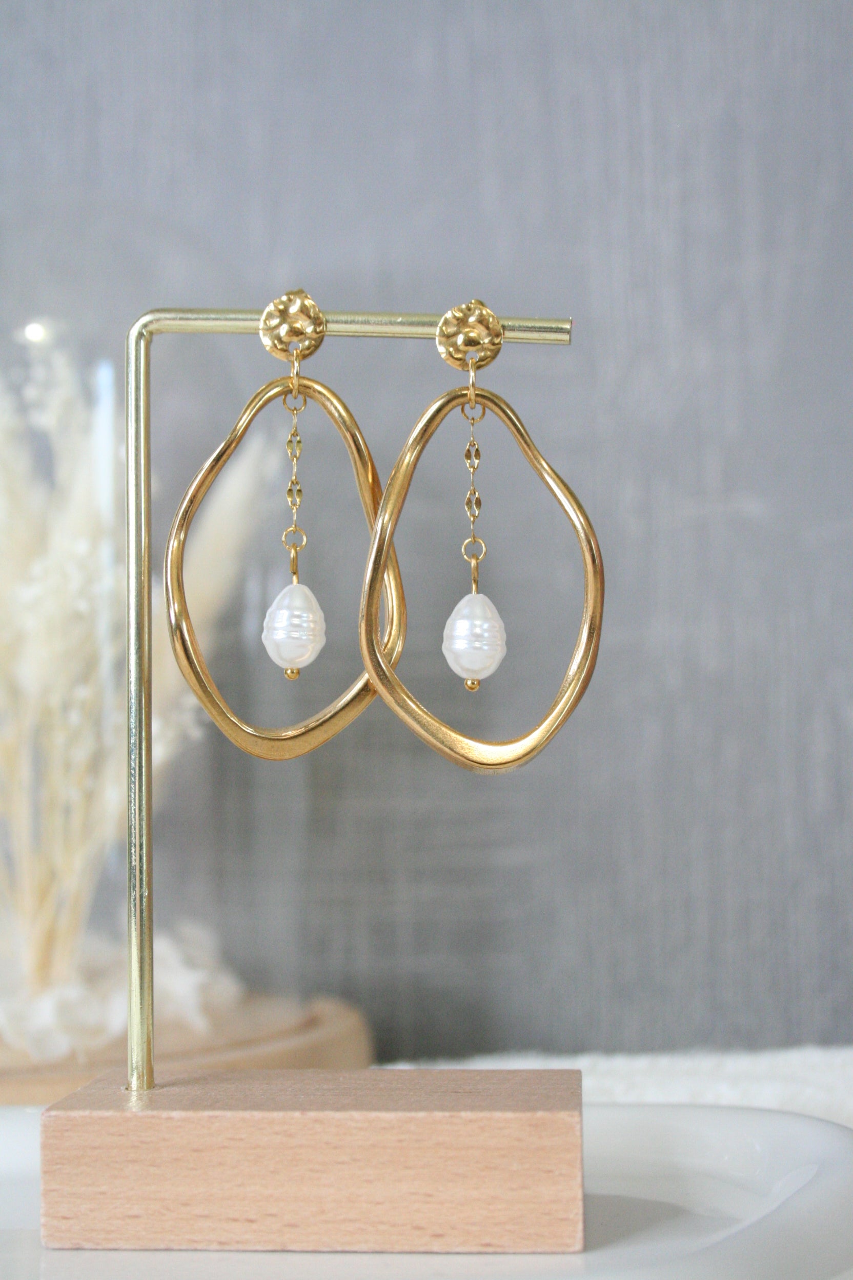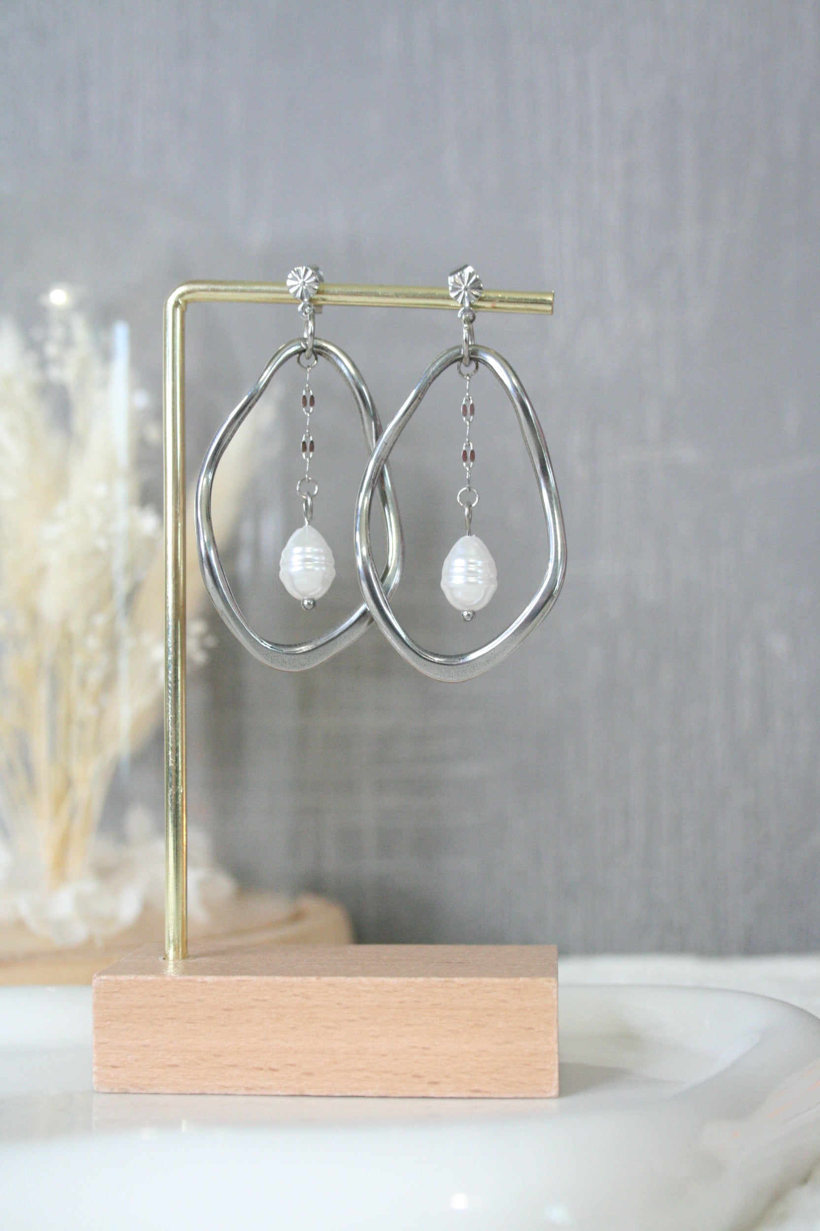 Modern and refined elegance, the Aurélie earrings are available in silver or gold . Each earring features an abstract oval pendant, adorned with a fine chain in the center and a delicate imitation freshwater pearl that subtly captures the light.