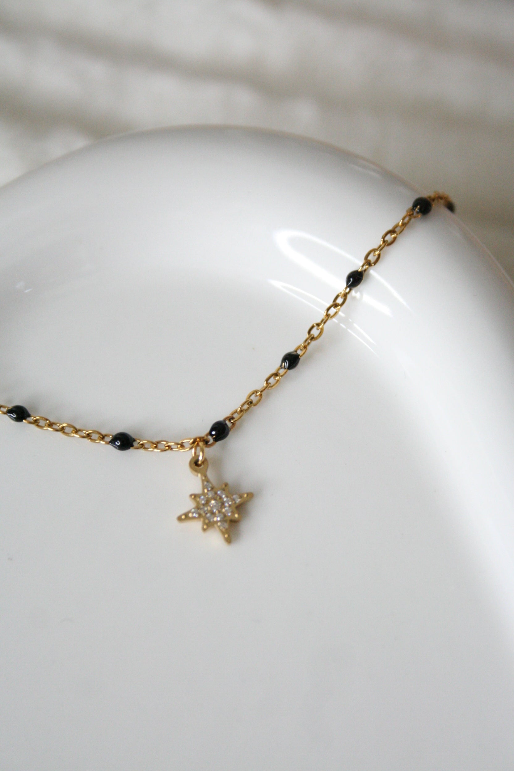 A fine and delicate piece of jewelry, ideal for a touch of light on the wrist. This bracelet is made of a fine gold-plated stainless steel chain, resistant and elegant, adorned with a small black bead that contrasts nicely with the gold. In its center, a discreet rhinestone star pendant subtly captures the light.