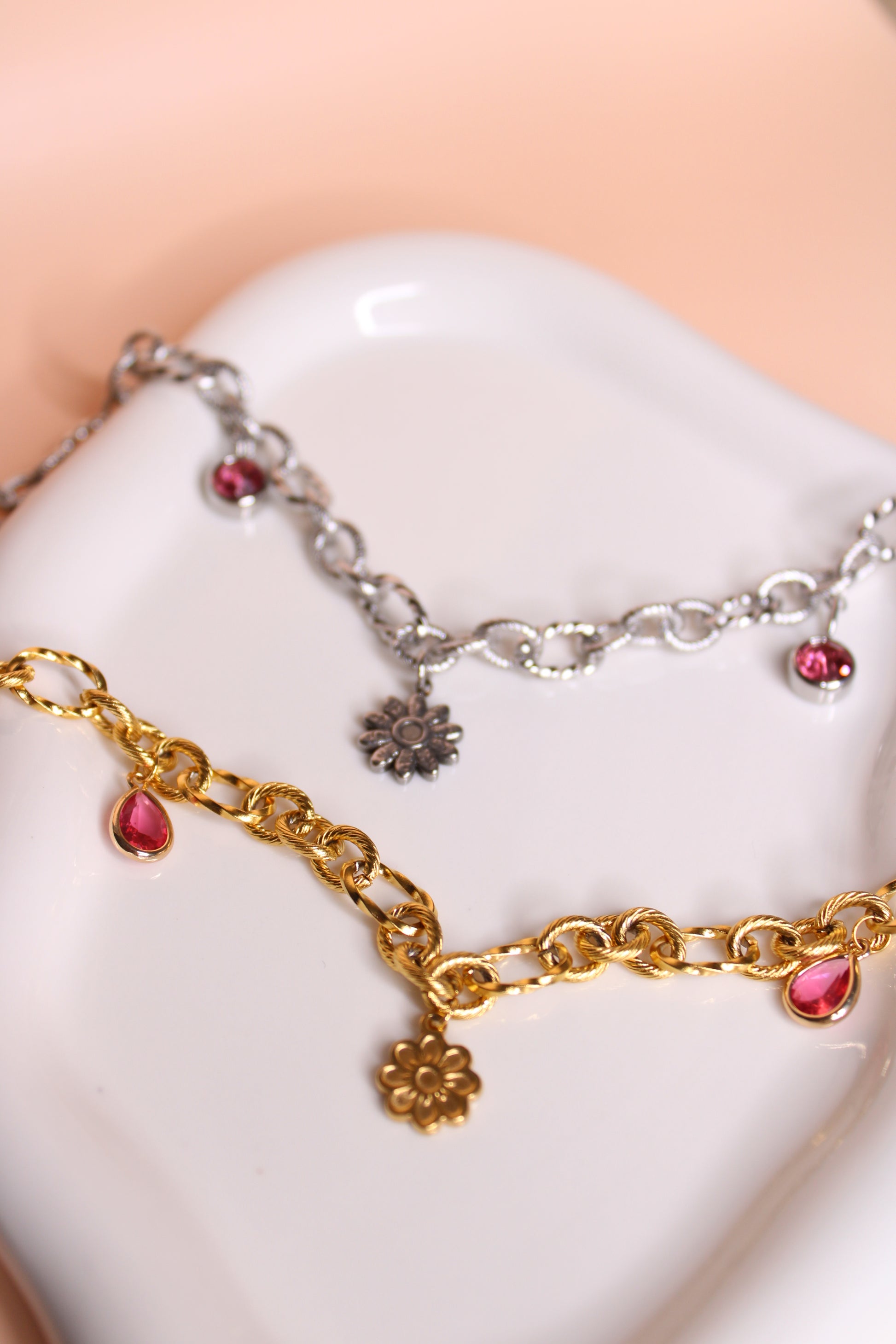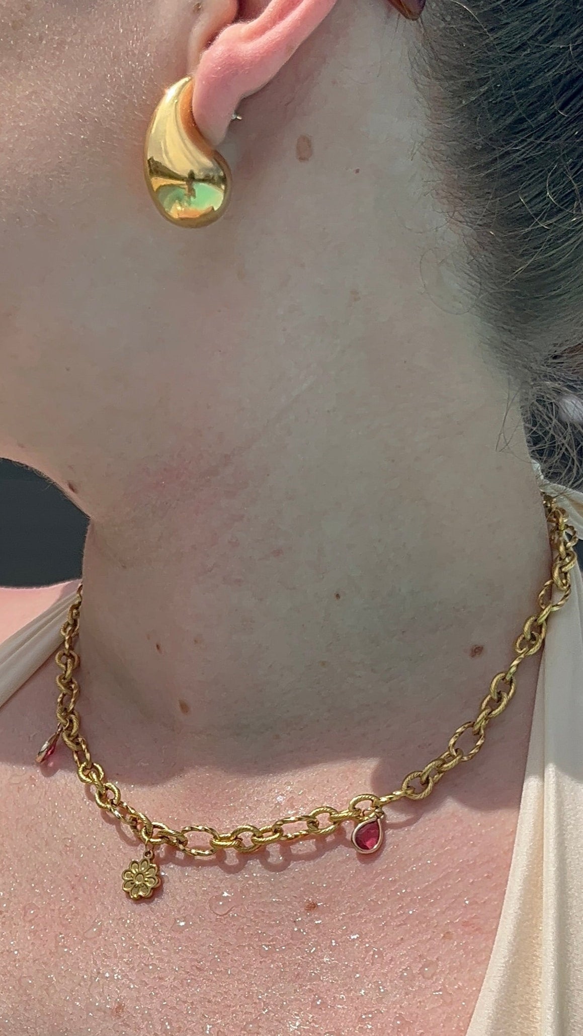 The Éclat de Grenade necklace in gold-tone stainless steel combines elegance and originality. Its textured chain features a delicate flower charm accompanied by two red brass charms, for a subtle and sophisticated touch of color. A perfect piece of jewelry to stylishly enhance any outfit, ideal for women who like to stand out with refinement.