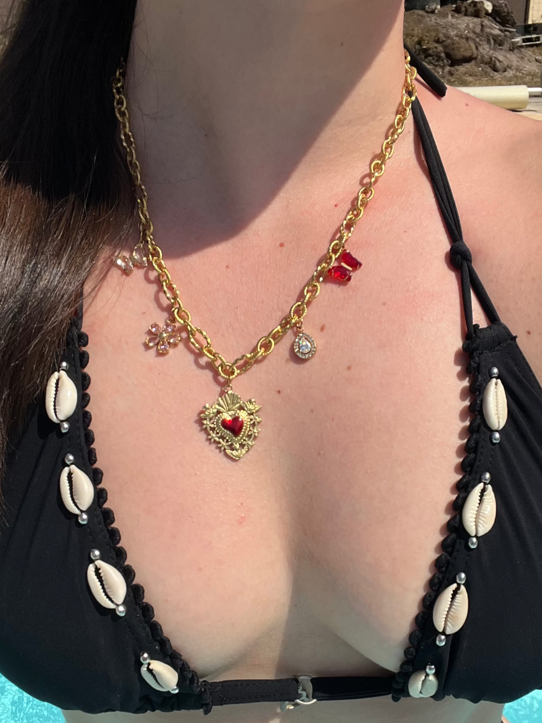 Its textured chain highlights a delicate charm: a red and white butterfly, a small heart, and a flower—like a little bouquet of love to carry close to you.