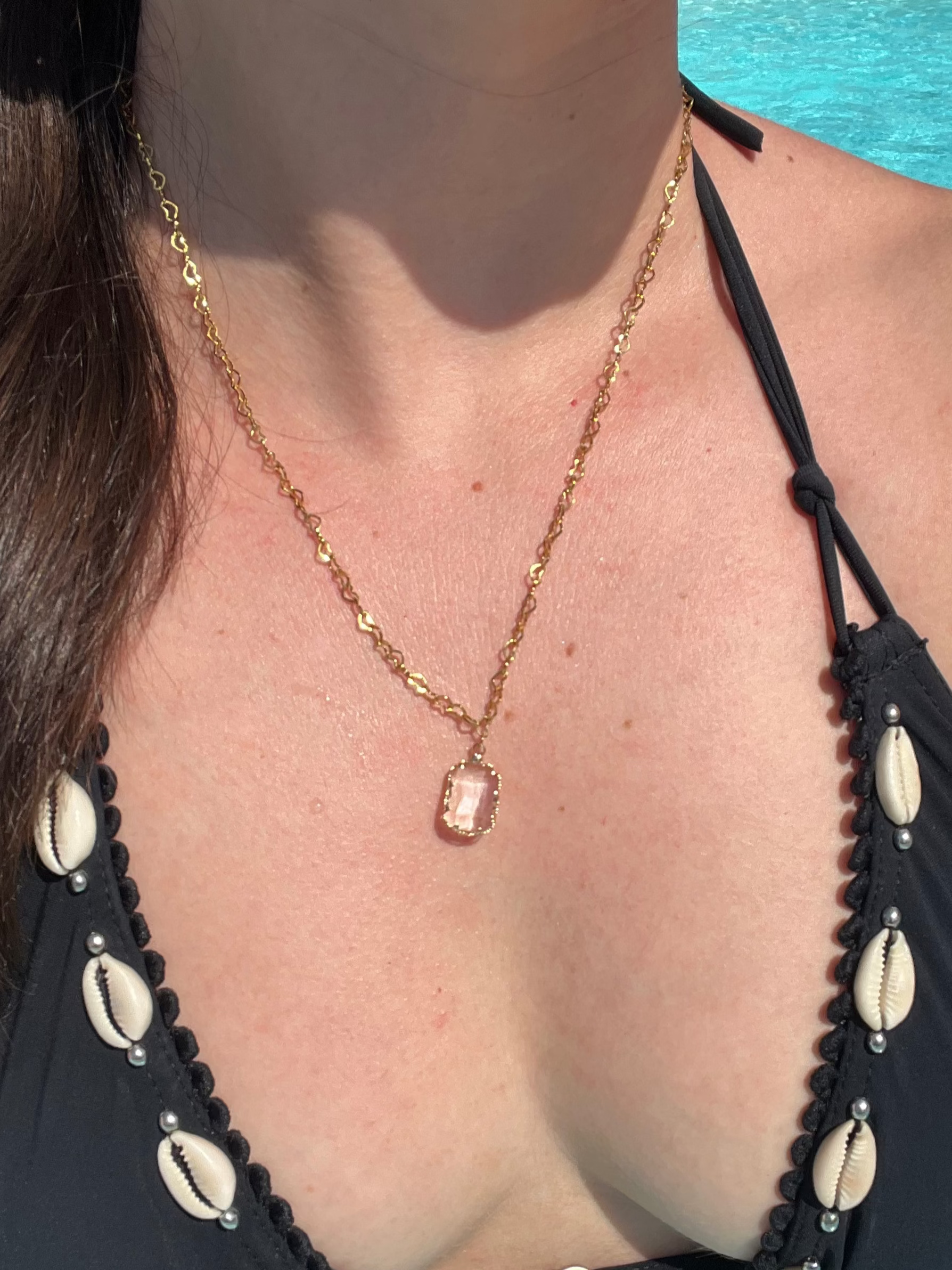The "Mélodie" necklace is a charming piece of jewelry, perfect for adding a touch of softness and poetry to your look. Its fine stainless steel chain, adorned with small hearts, is paired with a brass charm that adds a warm and unique touch.