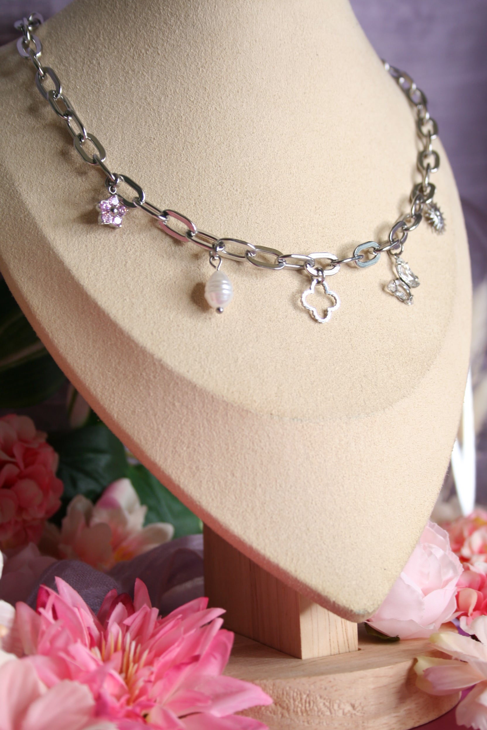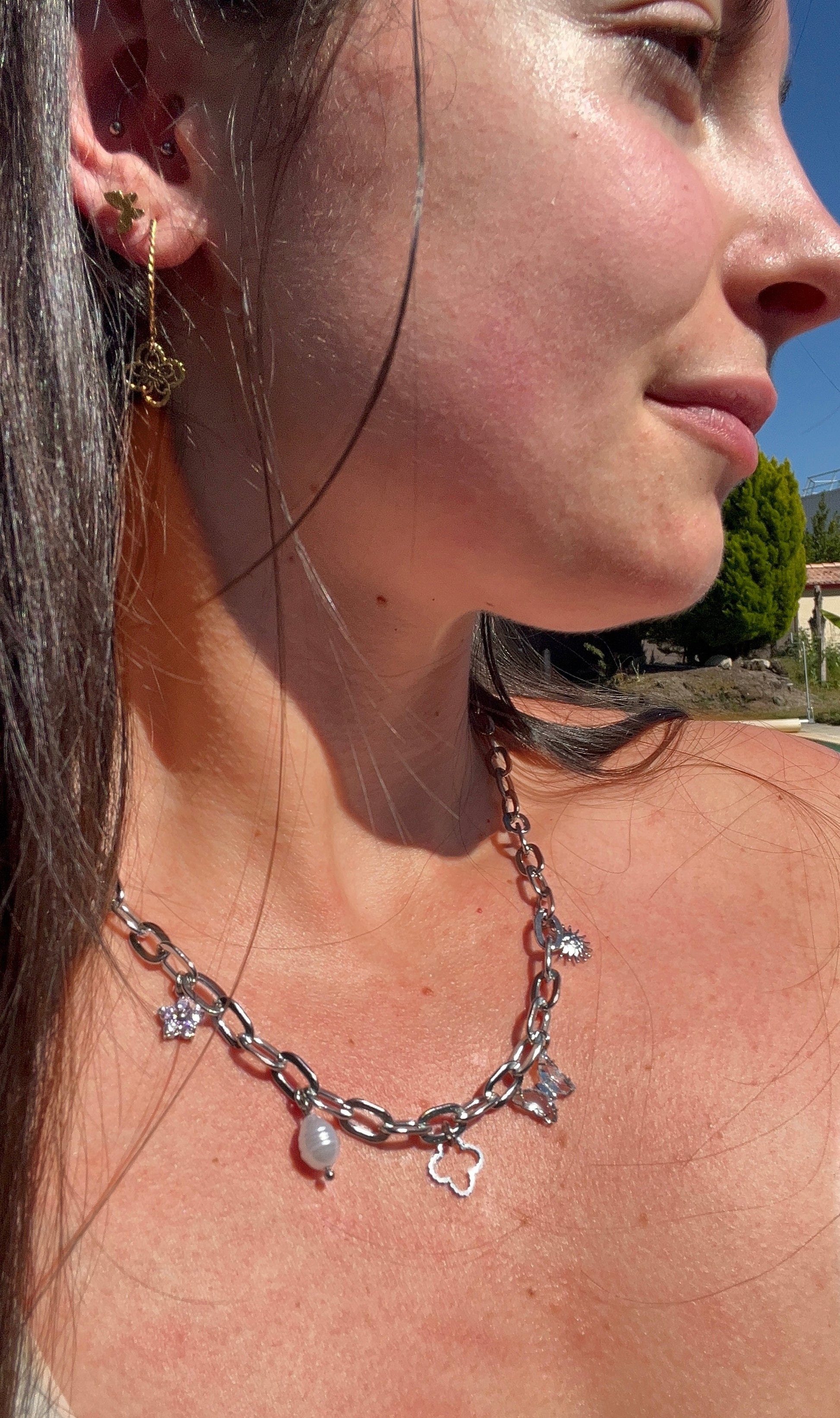 This silver charm necklace is a true celebration of nature and light . Its fine and delicate chain features pretty symbols: a butterfly for freedom, a sun for energy, a clover for luck, a flower for gentleness, and an imitation pearl for a touch of poetry.