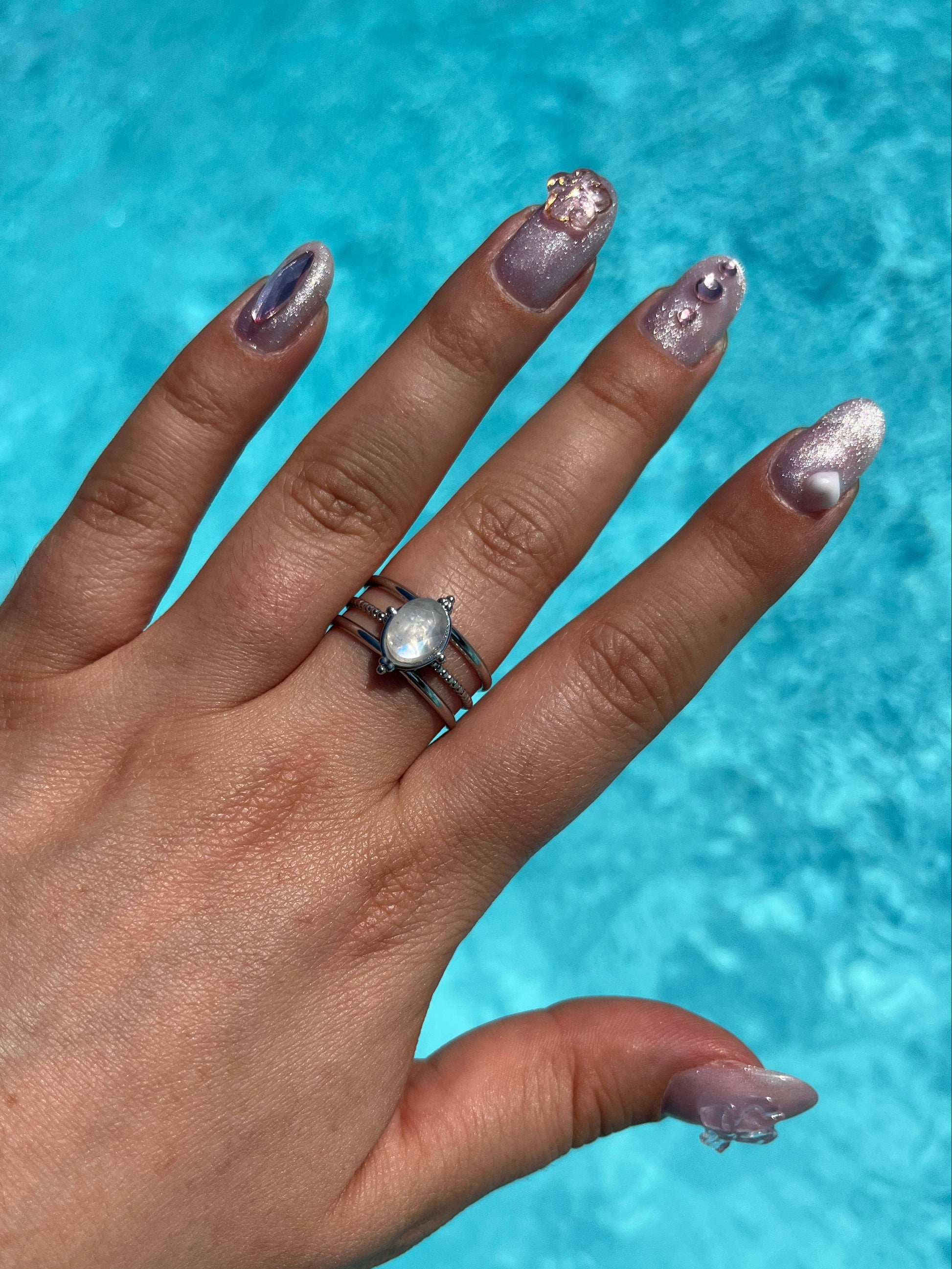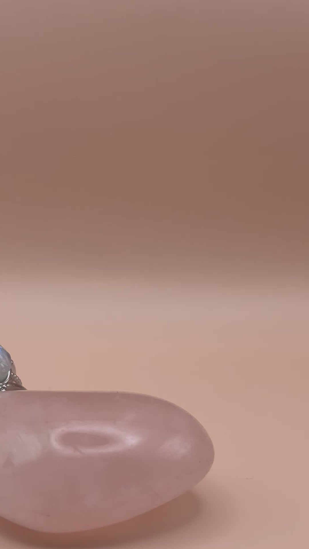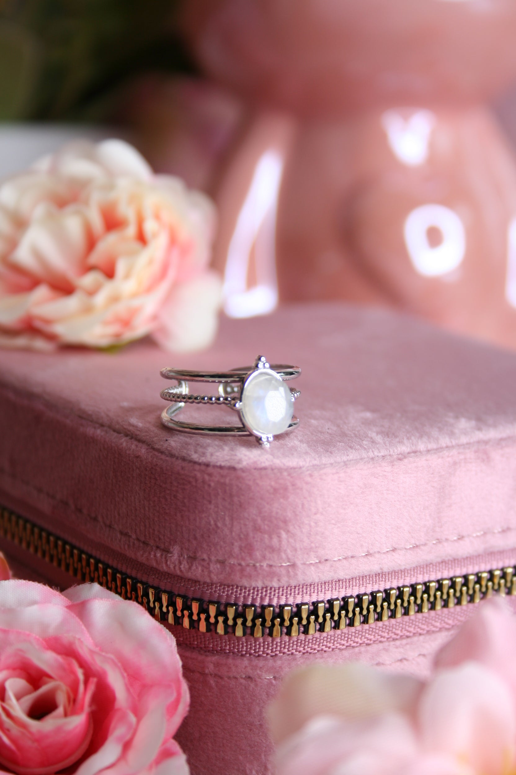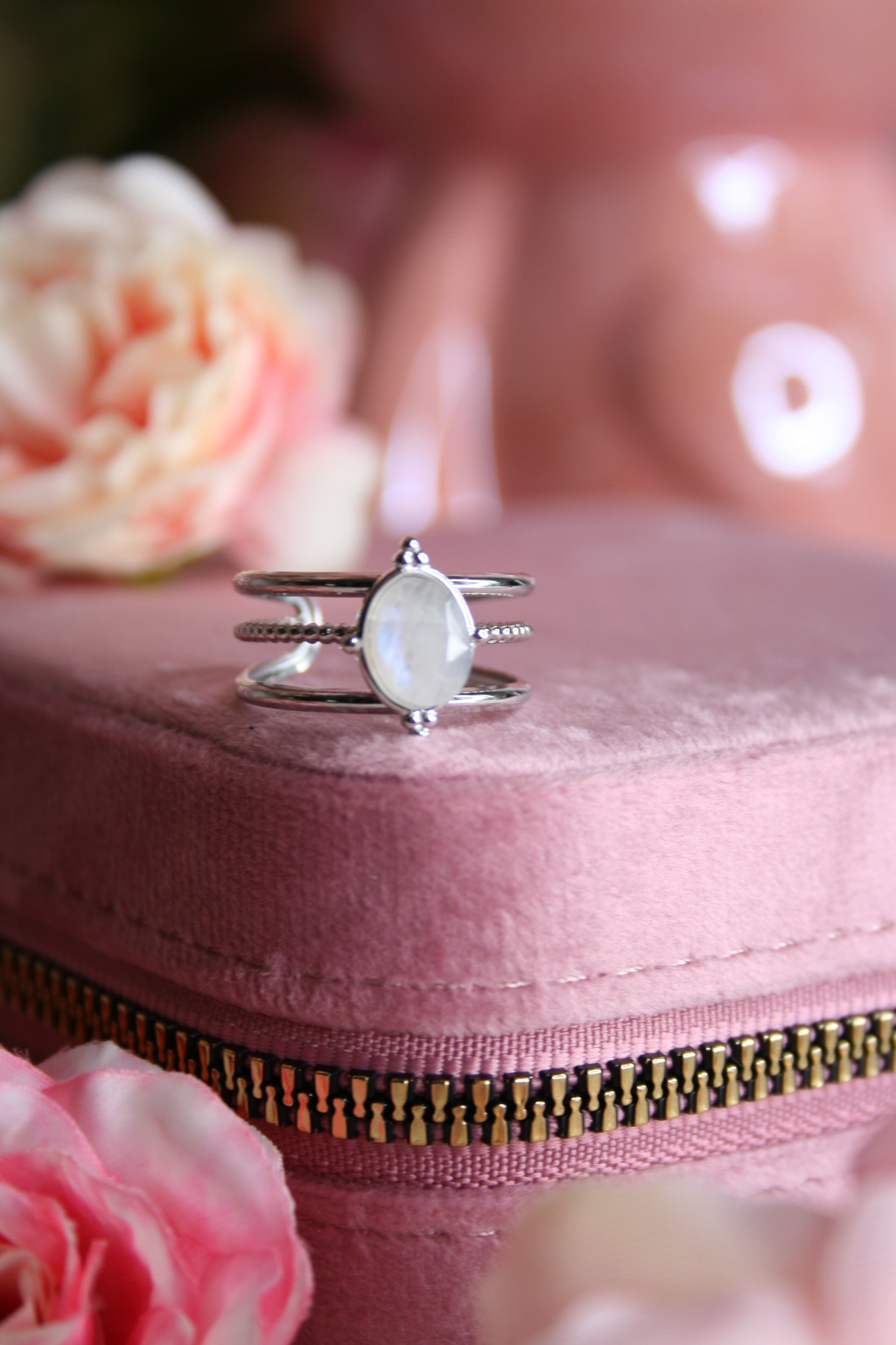 Argentée et délicate, elle est ornée d'une pierre de lune blanche aux reflets bleu doux, qui changent selon la lumière — un vrai petit trésor à ton doigt.
