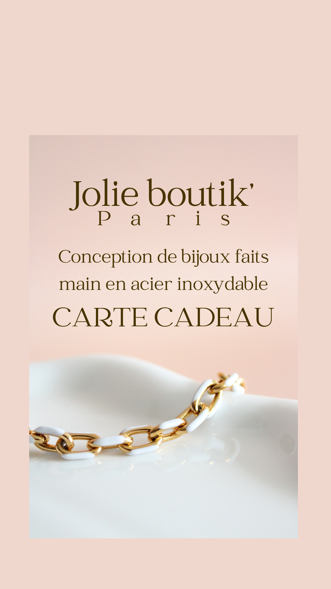 Vous cherchez LE cadeau parfait, mais vous hésitez encore ? Offrez une carte cadeau Jolis Bijoux et laissez vos proches choisir parmi nos magnifiques bijoux en acier inoxydable, faits main avec passion. Hypoallergéniques, résistants à l’eau et toujours à la pointe de la mode, nos créations sauront séduire tous les goûts et styles !