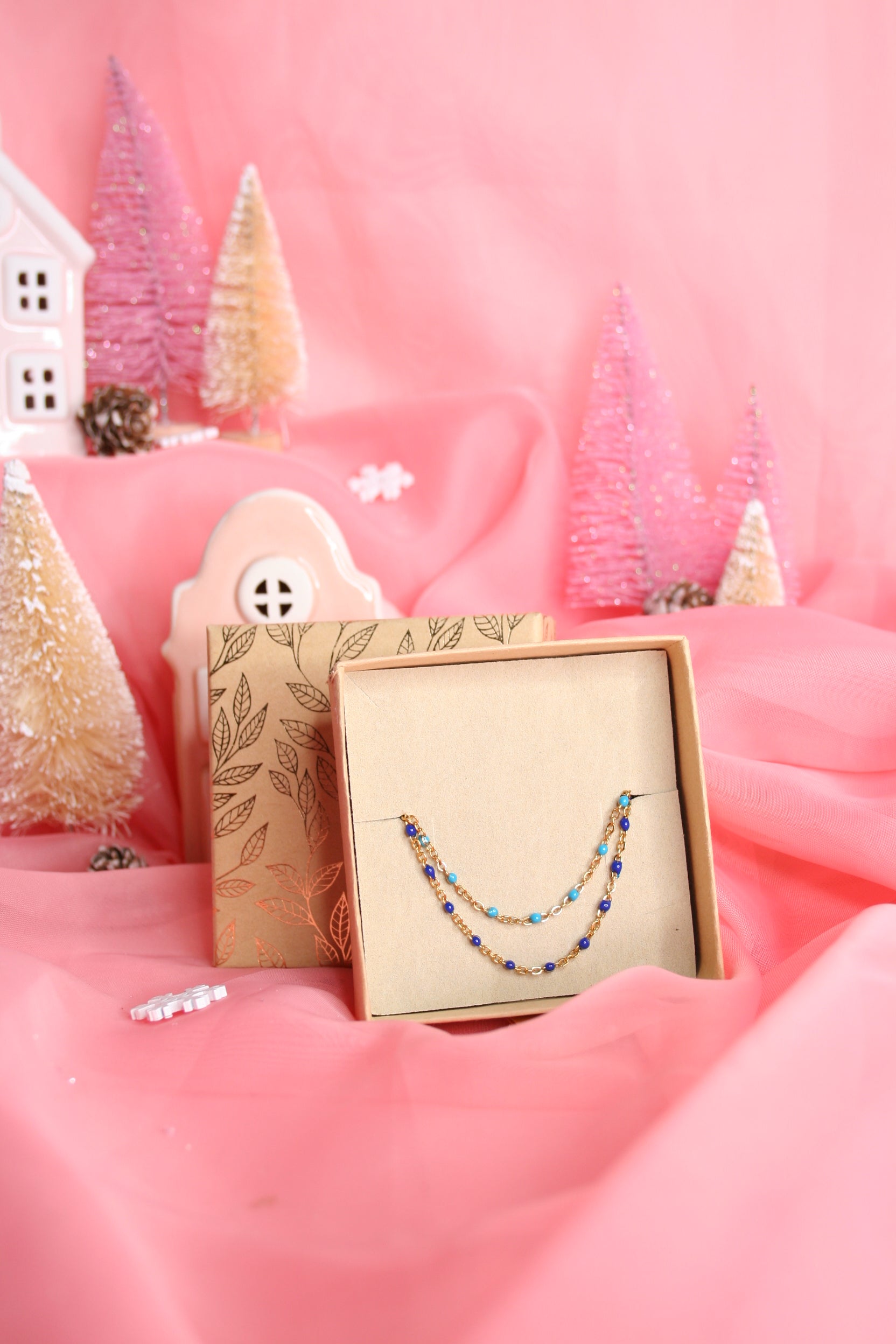 Le coffret comprend : Un duo de bracelets dorés ornés de touche de résine colorée, dans les tons de bleu, présentés dans une boîte prête à offrir.